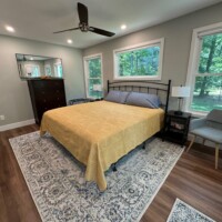 Expect to enjoy a newly renovated and furnished, clean, modern, cozy home with three bedrooms and two full bathrooms. It is located on a quiet cul-de-sac on the peaceful and relaxing private side of Lake Anna. Comfortably sleeps 9 with two bedrooms with king sized beds, and one with a queen bed and twin bunk beds plus an oversized chair that folds out twin bed in the loft. Features a large deck, screened porch and a balcony—all with lake views—and a private deck at the back of the house.